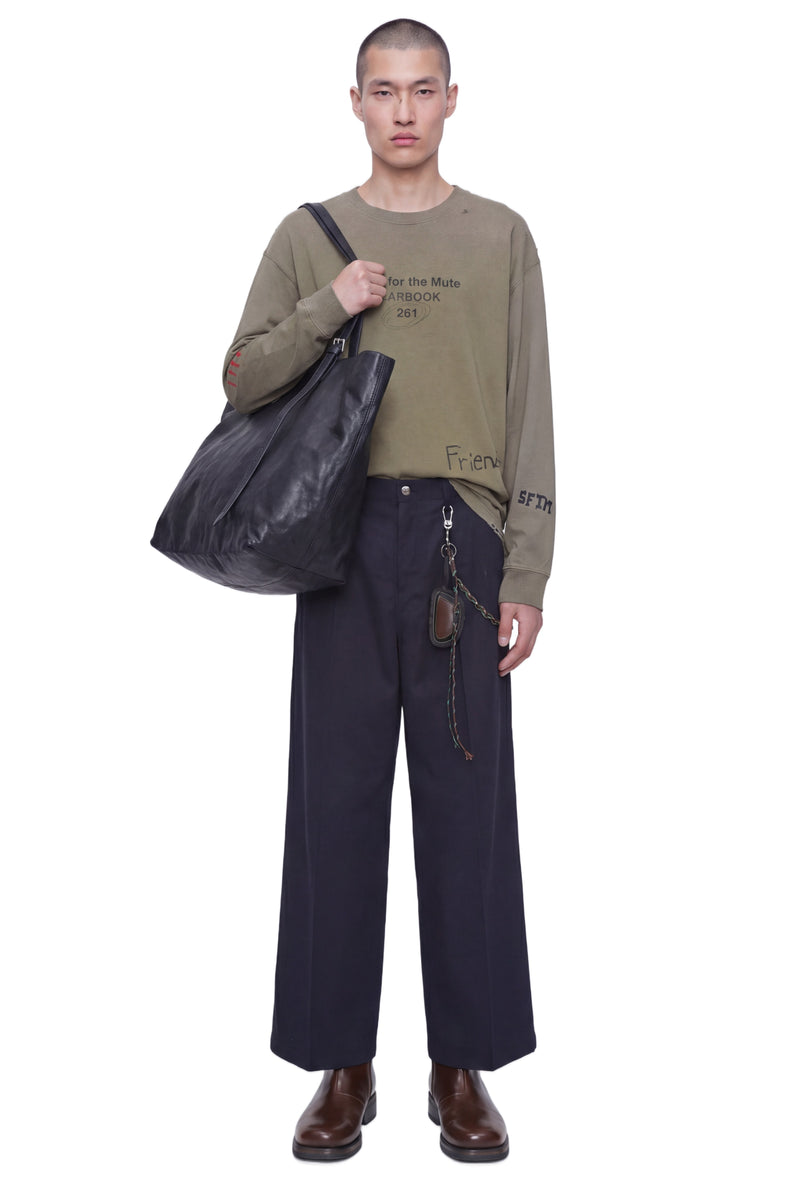 This ''Scribble'' Oversized Crew Neck Pullover reduces the garment to texture and memory. Distressed surfaces and hand-drawn motifs transform imperfection into sculptural, conceptual form.