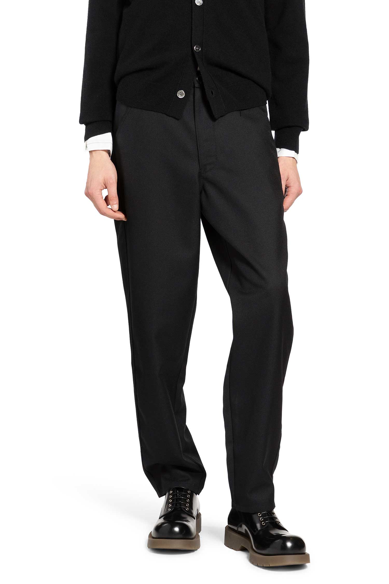 COMME DES GARCONS SHIRT introduces the Wide Leg Trousers in Firm Fabric, designed for those who value both style and substance. The deep black color and structured silhouette create a bold, modern look, while the firm fabric resists creasing and stands up to daily wear, keeping you sharp from morning to night. A relaxed wide leg fit ensures comfort and freedom of movement, and the concealed closure with discreet side pockets keeps the lines clean and functional. The rear yoke detail subtly shapes the fit, making these trousers a smart choice for any occasion.