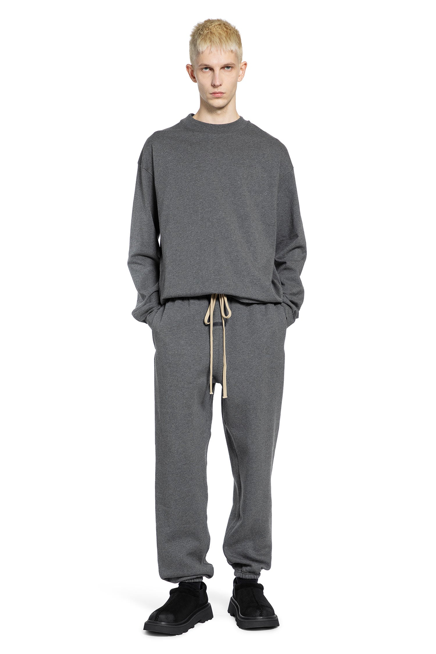 Classic sweatpants in charcoal heather, where Essentials' minimalist ethos meets functional design. Relaxed silhouette and subtle branding define the brand's disciplined, everyday aesthetic.