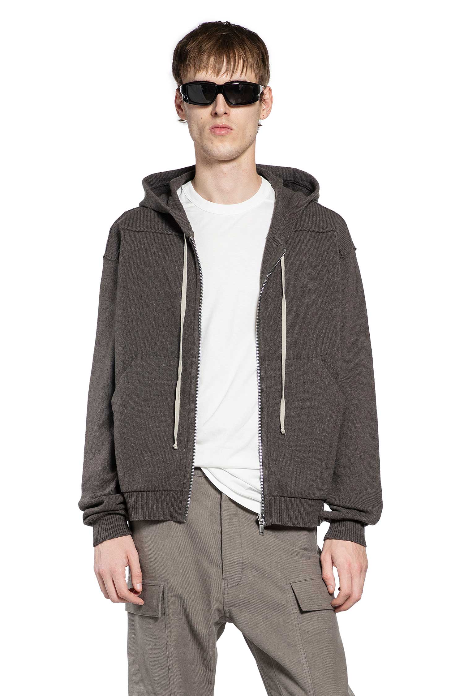 The Rick Owens Concordians Zipped Hoodie in Darkdust gives a classic hoodie an edgy, sculptural twist. Boiled recycled cashmere shapes a soft yet structured silhouette, while horizontal shoulder seams and the back signature seam add subtle tension.
