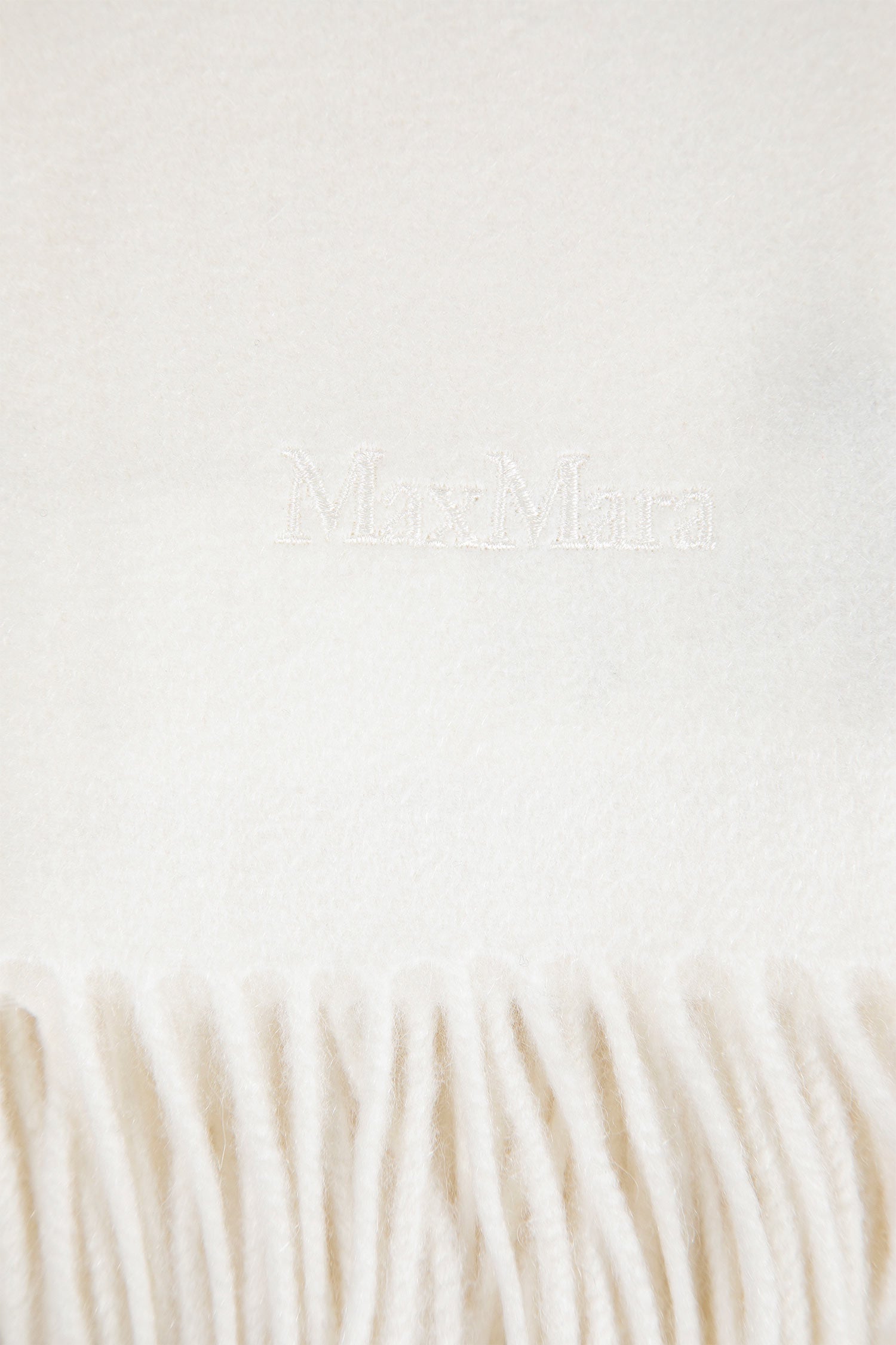 Max Mara Logo Embroidery Stole in Optical White turns pure cashmere into a canvas of understated identity. Fringed edges and subtle logo detailing trace refined presence through every fold.