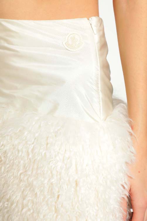 The Teddy-Trimmed Mini Skirt merges playful texture with technical design. Crafted in white nylon and soft teddy fleece, it features an internal grosgrain waistband for structure, a side zip for clean closure, and a front felt logo patch as a subtle signature. Lined in smooth viscose, the skirt balances tactile warmth with effortless shape, offering a modern, city-ready take on cozy sophistication.