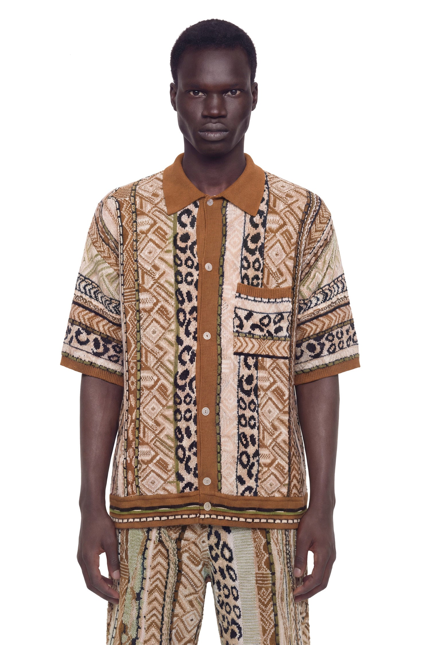 The Graphic Knit Short Sleeve Shirt embodies the brand's commitment to innovative knit design and thoughtful proportions. Its relaxed, textured silhouette reflects a modern, confident approach to casualwear.