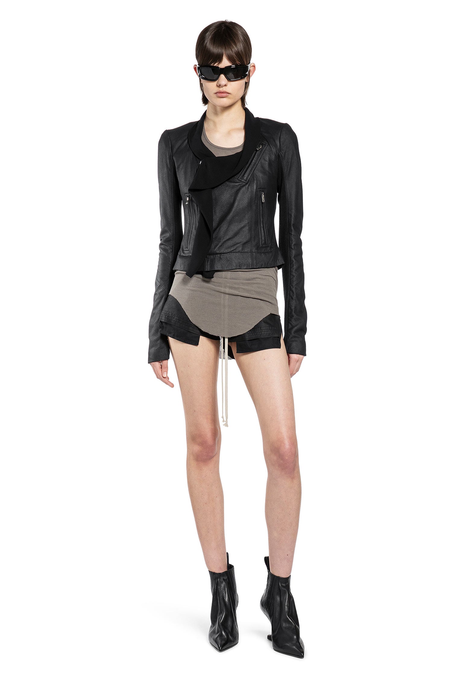 Dark elegance with a twist. This jacket fuses sculpted leather with a draped silk scarf, balancing sharp tailoring and fluid movement in a rebellious, modern silhouette.