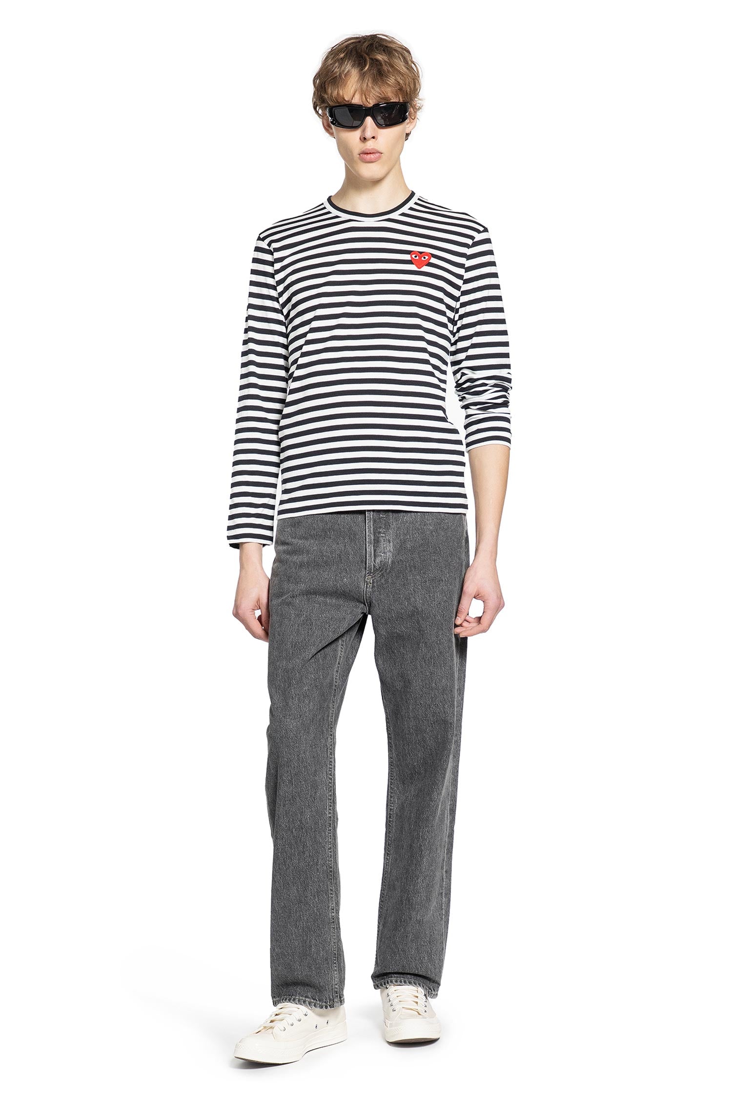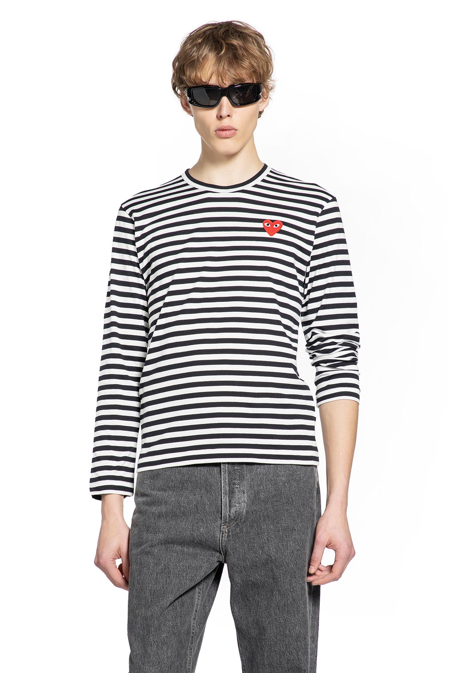 Comme des Garçons Play combines playful motifs with classic forms. The signature heart embroidery on a striped base transforms a simple long-sleeve tee into a subtly distinctive piece of modern, conceptual luxury.