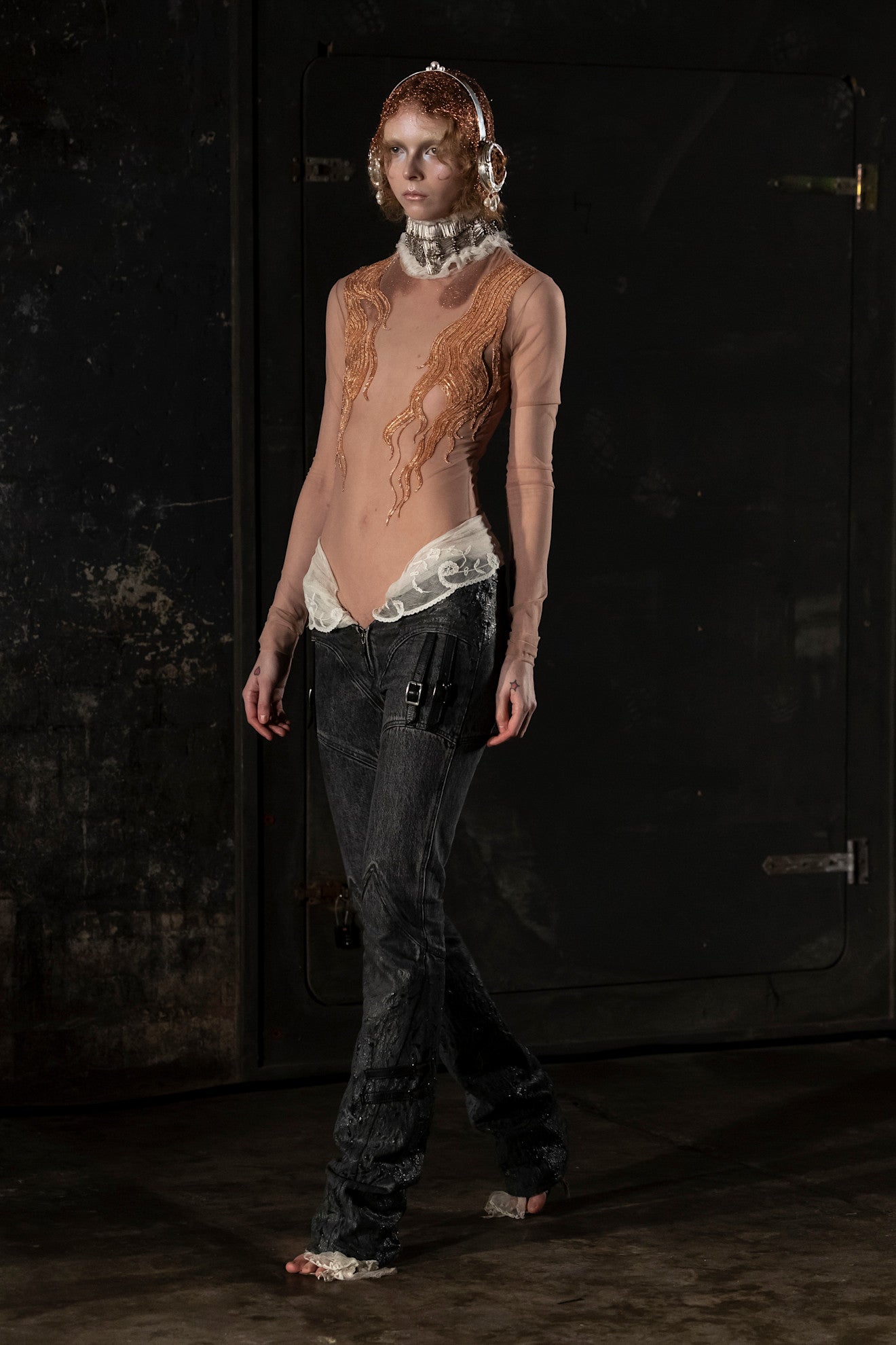 The Old Waves Bodysuit in nude, as seen on the runway, channels Dilara Findikoglu s darkly conceptual approach to the body. Cut from stretch sheer tulle, it clings like a second skin, creating an unsettlingly intimate canvas for the label s signature hair graphic chain embroideries, which ripple across the front in sculptural, textural strands. The piece balances fragility with aggression, turning the body into a site of tension, distortion, and deliberately provocative beauty.