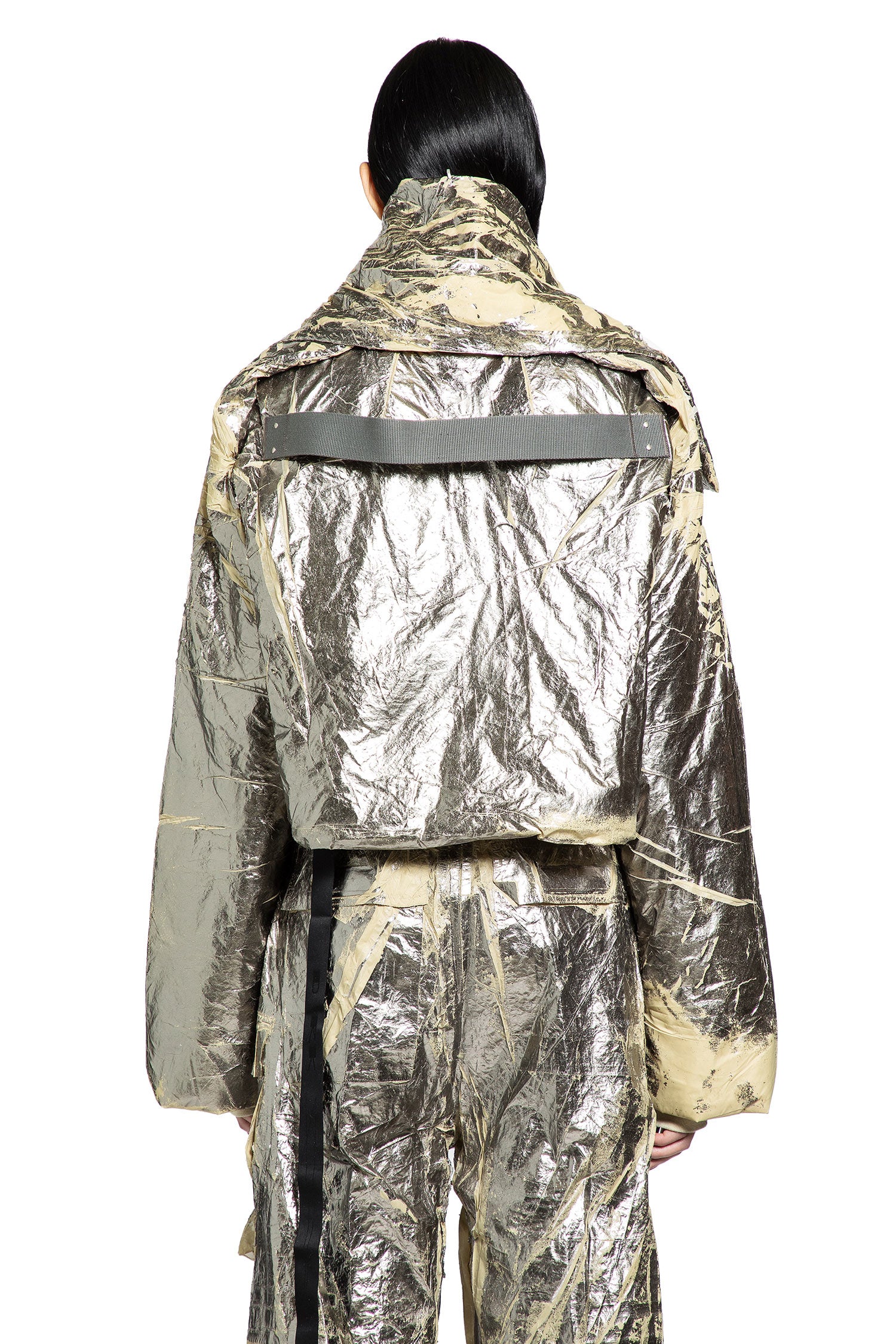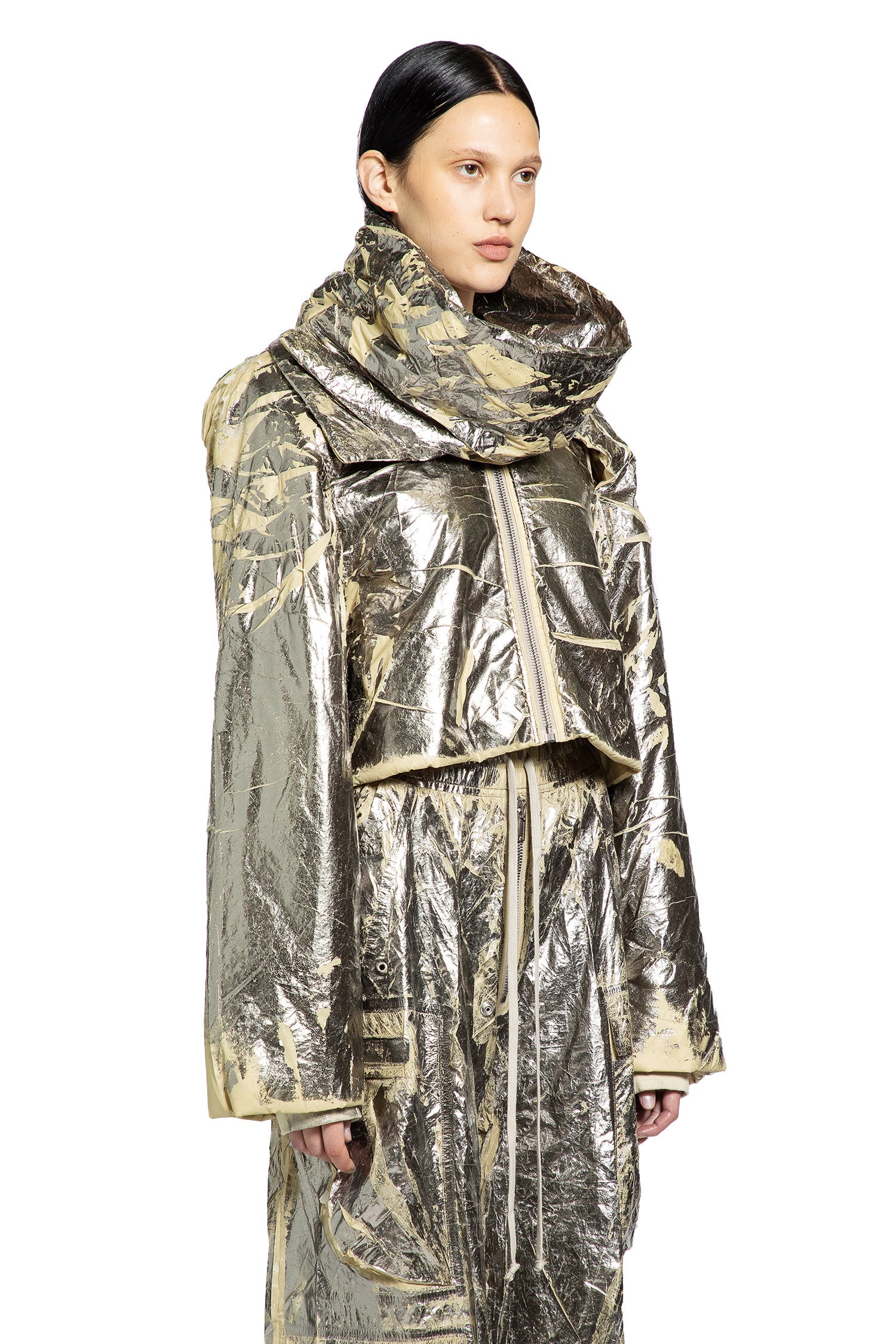 The RICK OWENS DRKSHDW convertible cropped jacket in palladium silver redefines modern style with its lightweight recycled nylon construction and striking palladium foil overlay, delivering a unique, futuristic finish. Crafted in Italy, this jacket is designed for versatility—wear it with the high funnel collar for bold impact or remove it to reveal a ribbed collar and edgy snap details. The center front zipper, top snap closure, and shoulder snaps let you customize your look, while the industrial cotton webbing strap and secure snap pockets add both attitude and function. Fully lined for comfort, this piece is a statement in sustainable, fashion-forward design.
