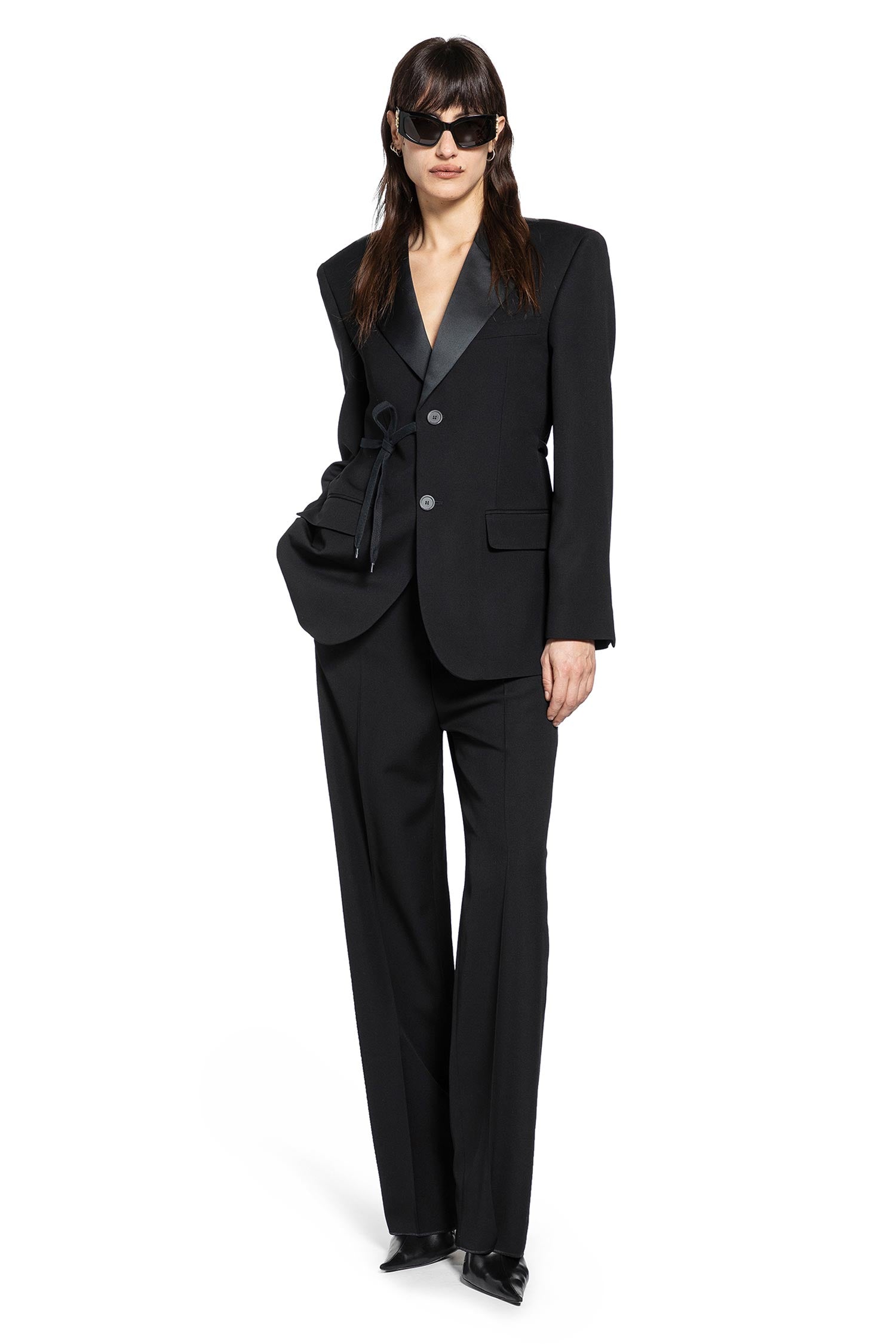 Balenciaga reworks classic tailoring through bold proportion and modern structure. These tuxedo trousers reflect the house's approach to redefining formalwear with contemporary edge.