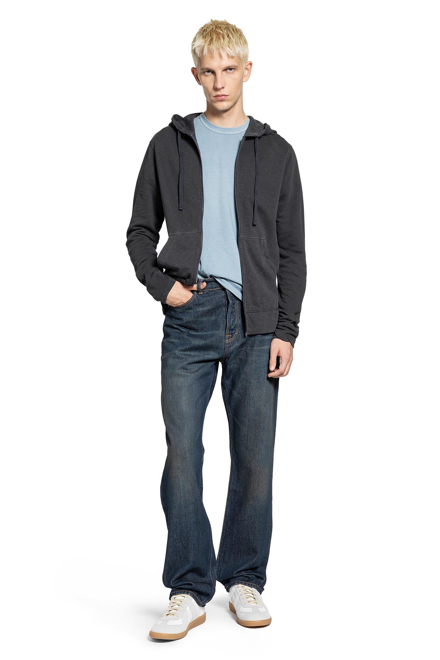 The James Perse Vintage French Terry Zip-Up Hoodie in carbon pigment blends relaxed layering with a worn-in aesthetic. Crafted from soft French terry, it features a hood with drawstrings, zip closure, and front pockets. Dropped shoulders, ribbed hem and cuffs, and a regular fit create a versatile, lived-in silhouette.