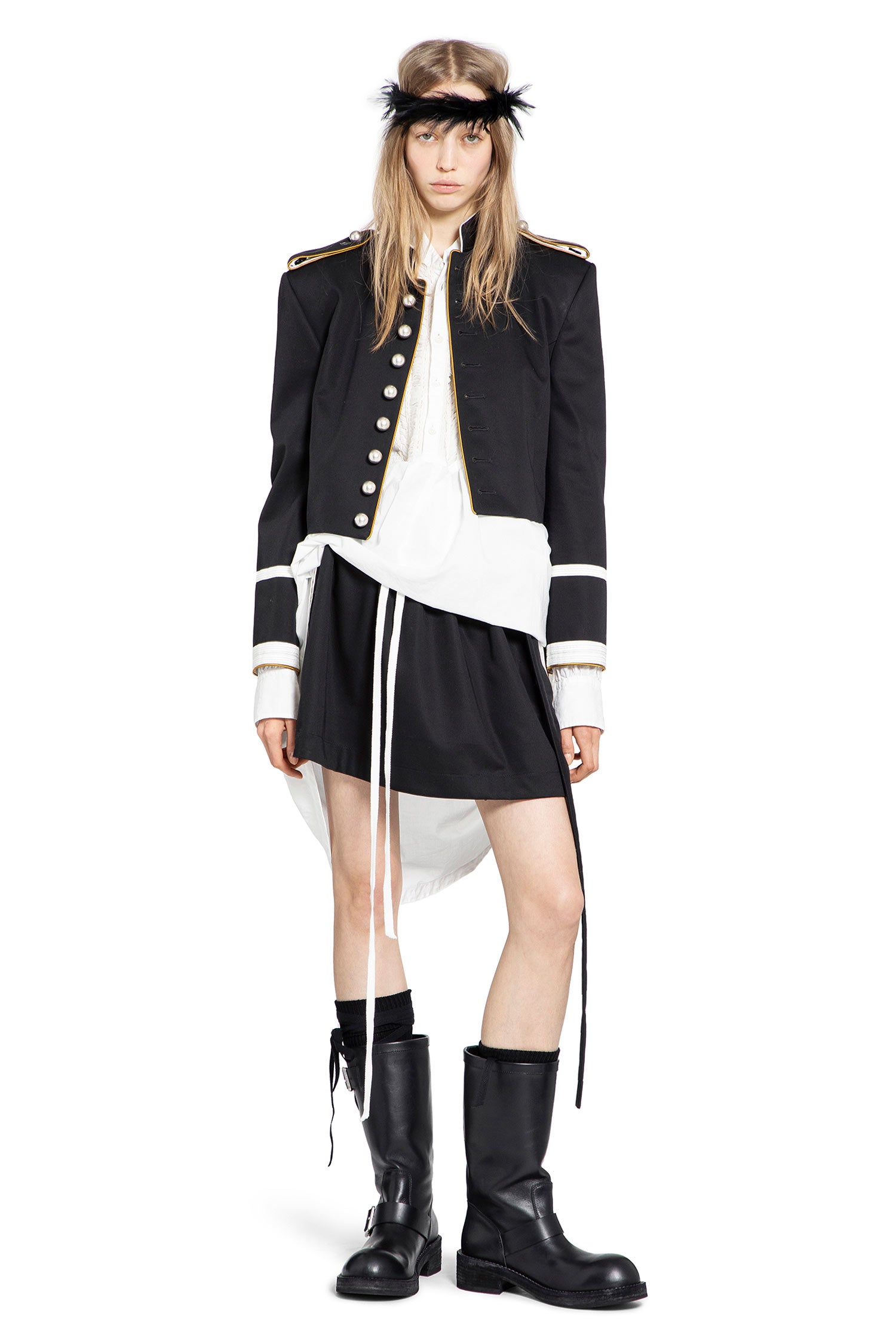 La jupe Haga Mini de Ann Demeulemeester canalise la subtile tension de la maison entre structure et fluidité. Les plis et les accents en gros-grain signature reflètent son approche sculpturale et avant-gardiste de la couture moderne.