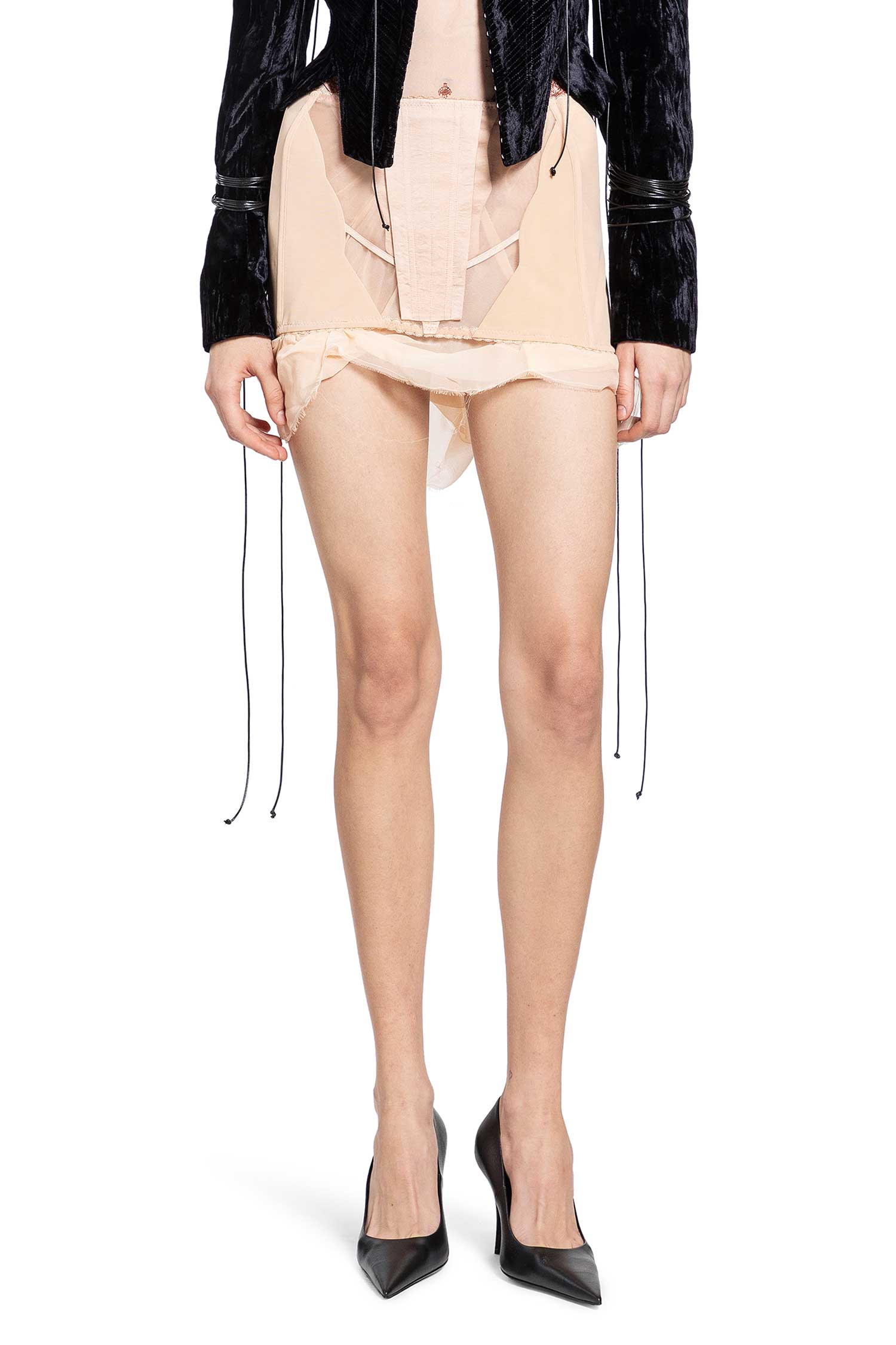 Questa combinazione di gonna a strati e sottoveste in nude e bianco fonde satin e tulle per un effetto drammatico e testurizzato. Modella il corpo mentre i bordi in pizzo aggiungono un dettaglio delicato e sovversivo. Un pezzo che bilancia eleganza e audacia, trasforma le forme classiche ispirate alla lingerie in una dichiarazione concettuale audace.