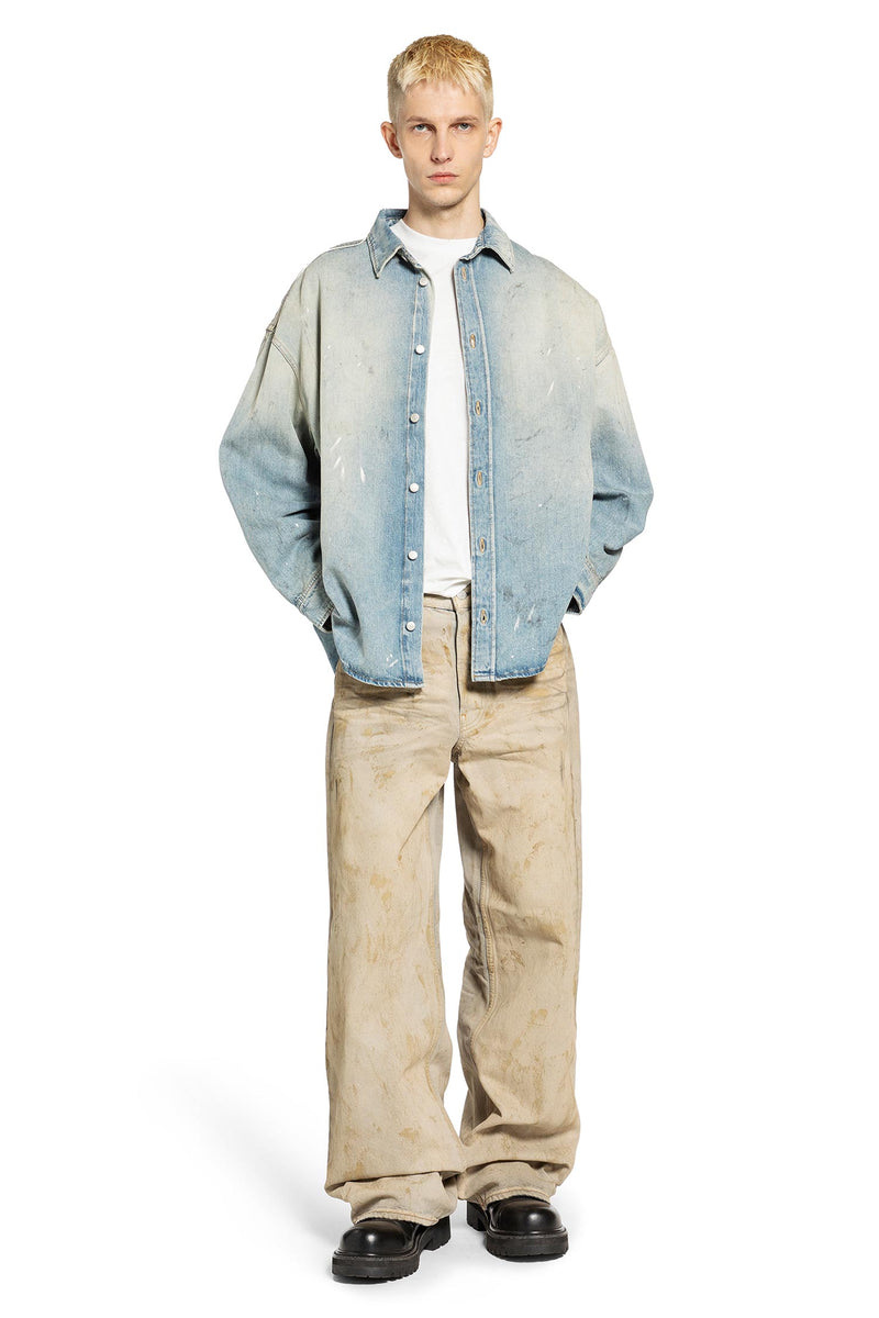 The denim shirt, through the brand s lens: worn textures, subtle disruption, and relaxed form reflect its conceptual, modern approach to utilitarian codes.blue