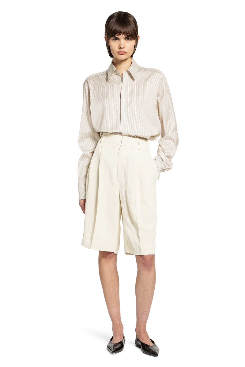 Shorts in lino e viscosa color avorio che fondono la leggerezza estiva con la precisione sartoriale. Pieghe fluide sul davanti e un taglio generoso creano una silhouette fresca e ariosa. Semplici, raffinati e perfetti per vestirsi con il caldo.