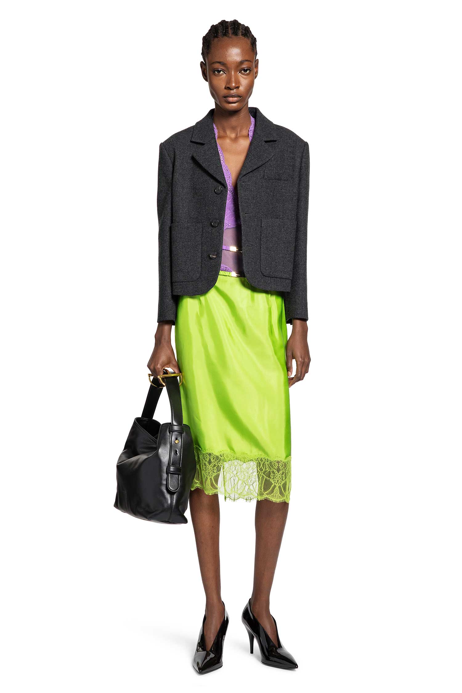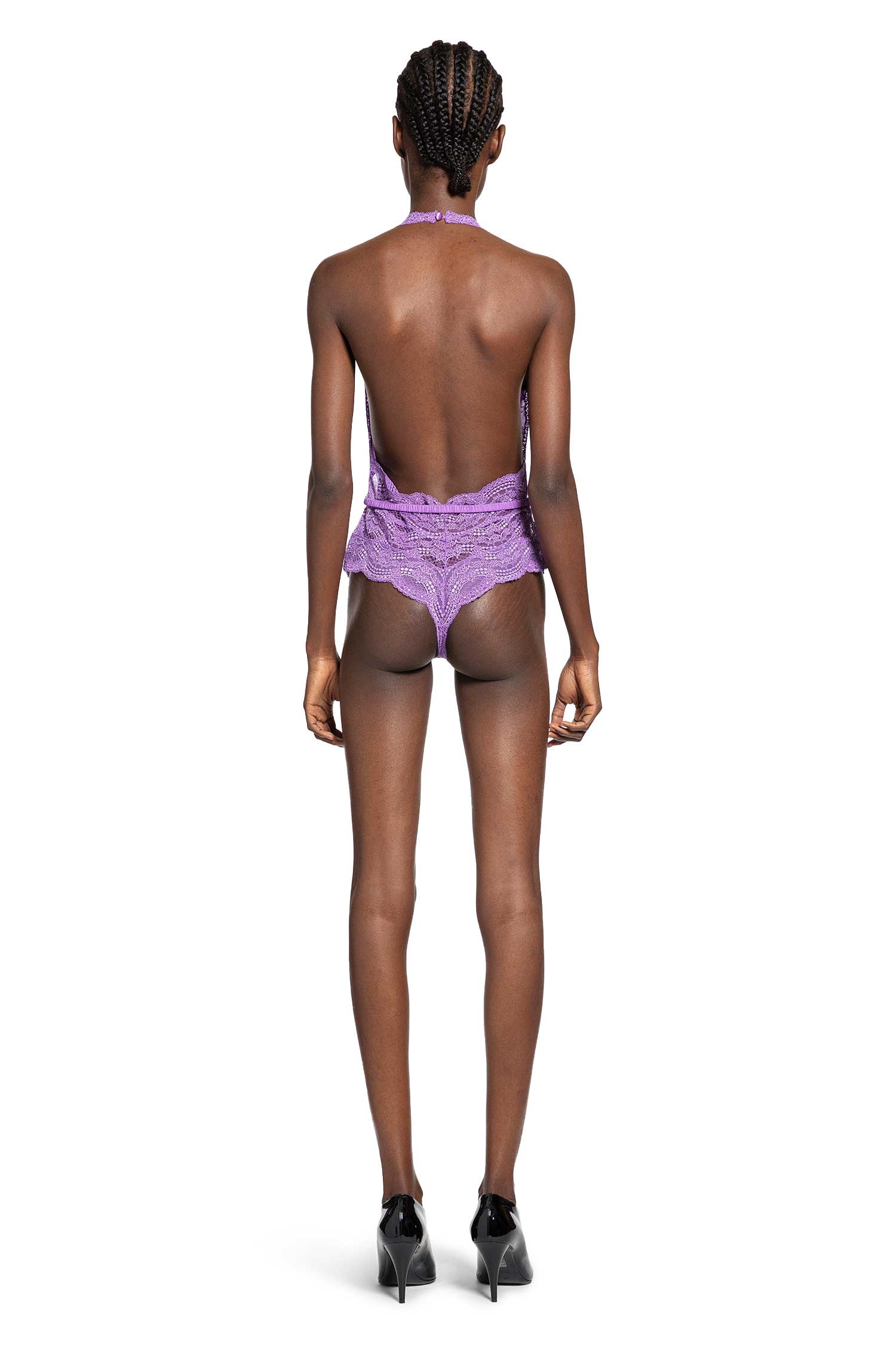 From the Fall Winter 2025 Runway Style collection, this dress in variation purple floral lace exudes sensual sophistication. Defined by a deep plunging V-neck and buttoned halterneck, it reveals a bold front cut-out and open back for a striking silhouette. The elasticated ruched waistband with an engraved-logo buckle enhances its structure, while the sleeveless design and fitted shape create an effortlessly modern allure.