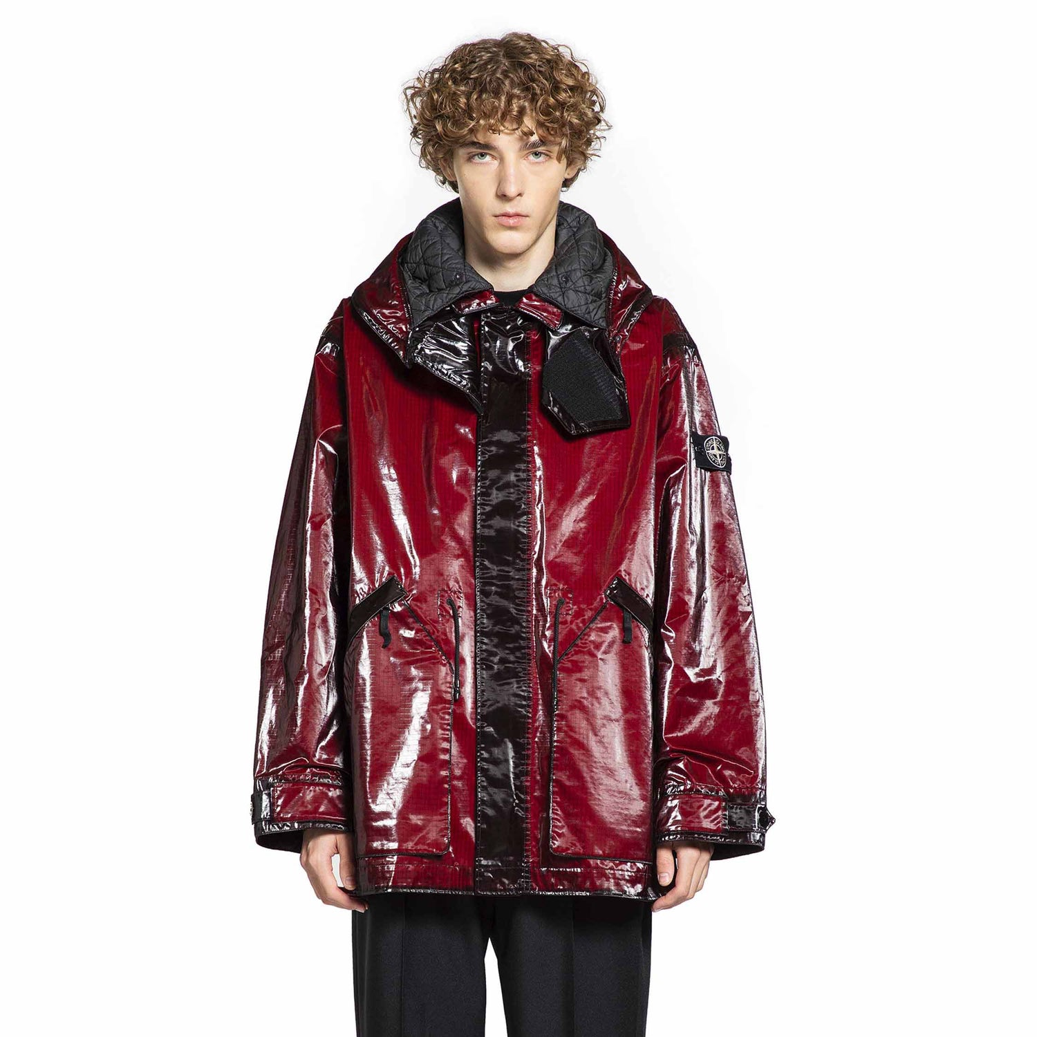 • ▪ The Stone Island Dimensional Red 4100079 Parka in Bordeaux pushes technical outerwear into a conceptual, cutting-edge realm. Constructed from coated nylon ripstop, it features a fixed Velcro hood, press-stud and zip closure, and streamlined side pockets. Dropped shoulders, modular press-stud cuff tabs, and a removable sleeve logo badge sculpt the silhouette, transforming functional details into bold, design-forward statements that embody Stone Island s avant-garde approach to modern utility.