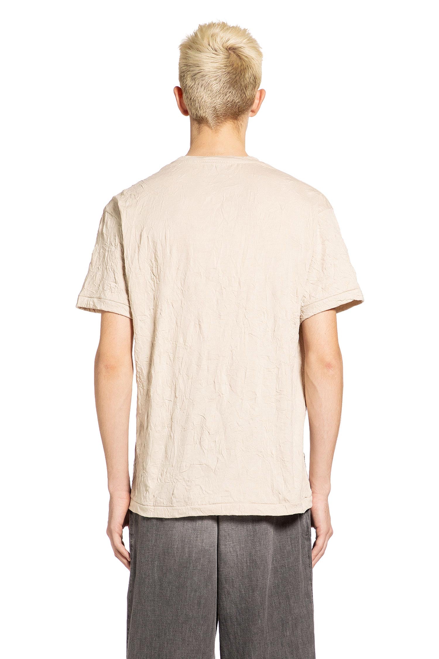 Giorgio Bratoのクリンクル加工コットンナイロンTシャツは、シンプルな定番を質感と都会的な実用性の研究に変えます。そのダメージ加工された生地とリラックスしたプロポーションは、ブランドの職人的なディテール、素材の本物性、現代的で使い込まれたエレガンスへのこだわりを反映しています。