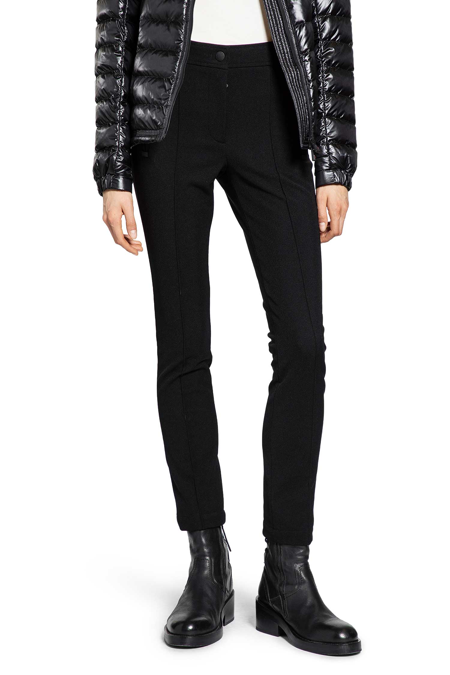 MONCLER GRENOBLE skinny trousers in classic black bring a sharp, tailored look with their slightly stretchy fabric that moves with you for all-day comfort. The smooth front and uninterrupted side seams create a refined, minimalist silhouette, while the discreet waistband closure ensures a sleek finish that elevates any outfit. Made in Romania, these trousers are a versatile staple, seamlessly pairing with both casual and formal pieces for a confident, fashion-forward statement every time you wear them.