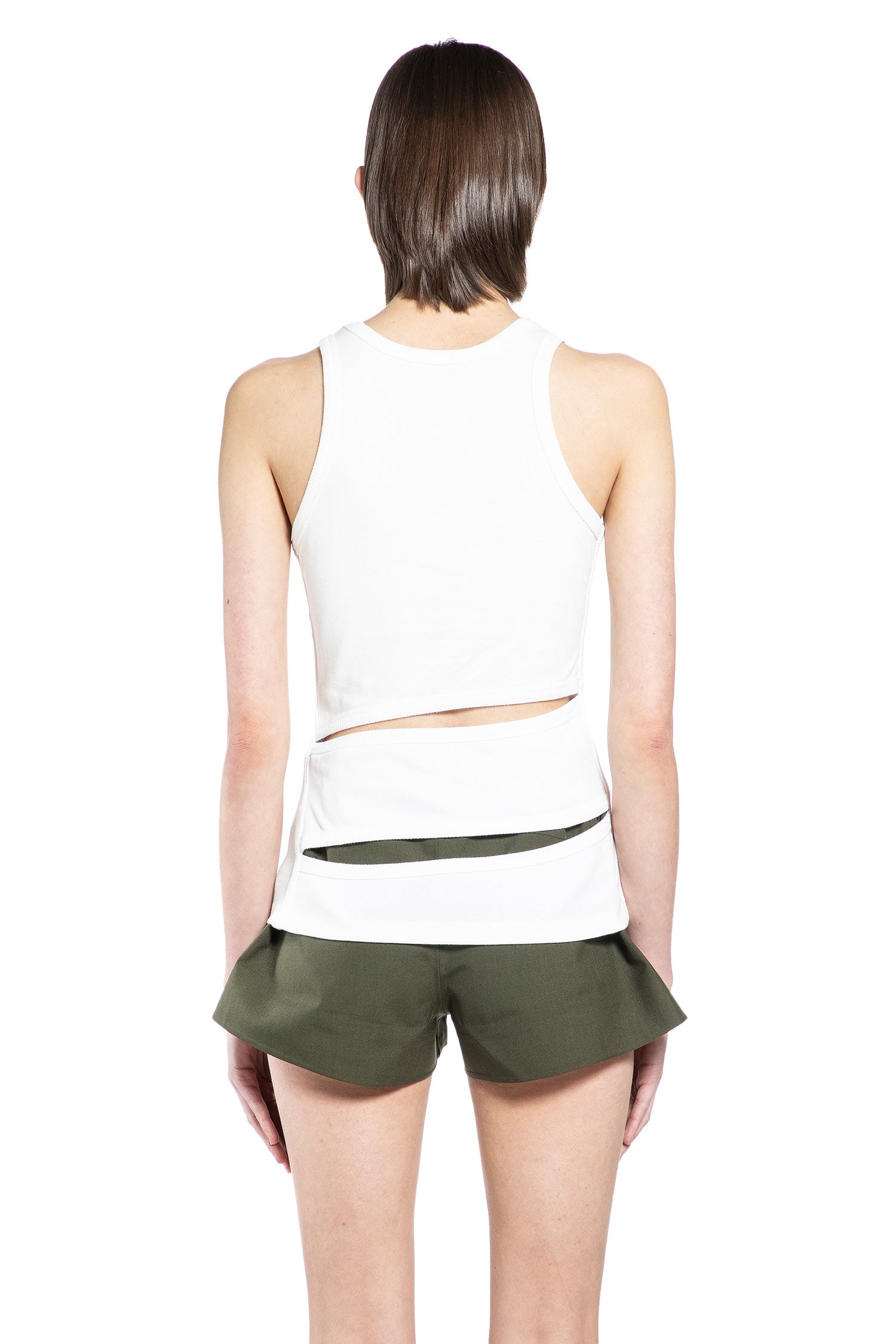 부드러운 면으로 제작된 이 탱크탑은 몸을 유연하게 감싸는 나선형 컷아웃이 특징입니다. 몸에 맞춘 실루엣이 자연스러운 몸의 선을 따라가며, 곡선형 개구부는 커버와 노출의 그래픽한 상호작용을 도입합니다. 깔끔한 마감과 최소한의 네크라인으로 디자인을 날카롭고 정제된 상태로 유지하여 조각적인 나선형 구조가 초점이 되도록 합니다.