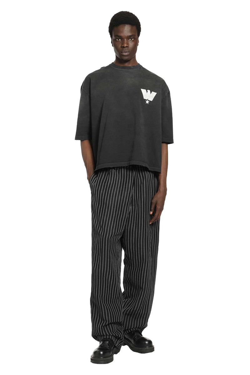 Willy Chavarria 패션 서비스 협회. 블랙 뷰티 프레임의 버팔로 티셔츠는 브랜드의 커뮤니티와 문화적 논평 렌즈를 통해 대담한 앞면과 뒷면 그래픽을 제공합니다. 착용 효과가 있는 면과 오버사이즈 드롭 숄더 실루엣은 차바리아의 날카롭고 목적 있는 형태 접근 방식에 기반을 둡니다.