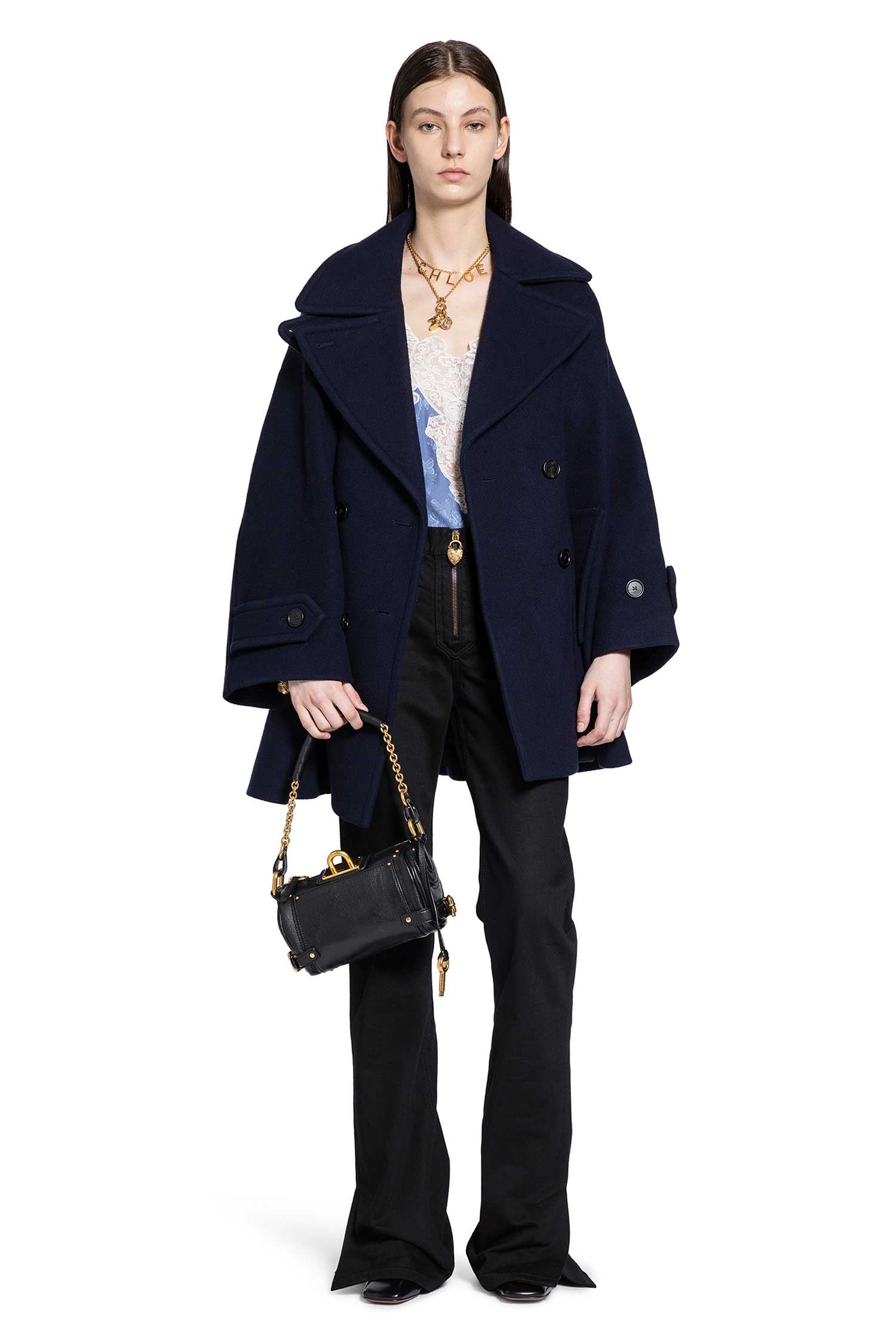 The Slim Jeans in black cotton denim fuse urban edge with refined detailing. Featuring belt holes, a gold-metal zip closure with heart lock pull, and practical side and back pockets accented with a back leather logo patch, these jeans are finished with back gold-metal D-ring and hem splits. The slim fit ensures a sleek, contemporary silhouette with a subtle avant-garde touch.
