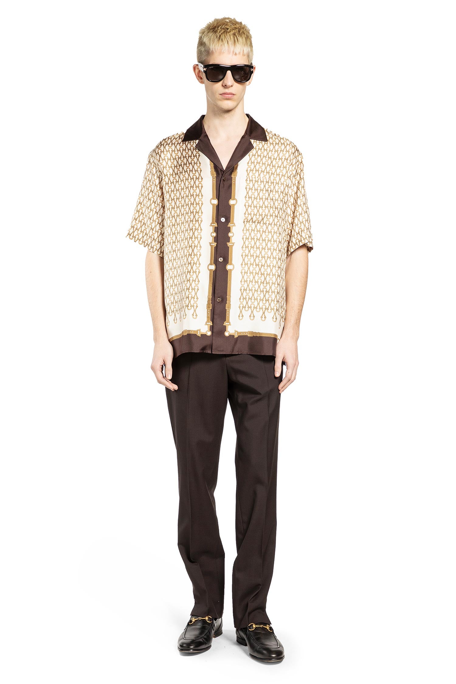 Gucci's Equestrian Silk Print Bowling Shirt transforms heritage motifs into contemporary luxury, blending tradition with modern style. It embodies the brand's vision of fashion as storytelling, where pattern and silhouette convey identity and aspiration.