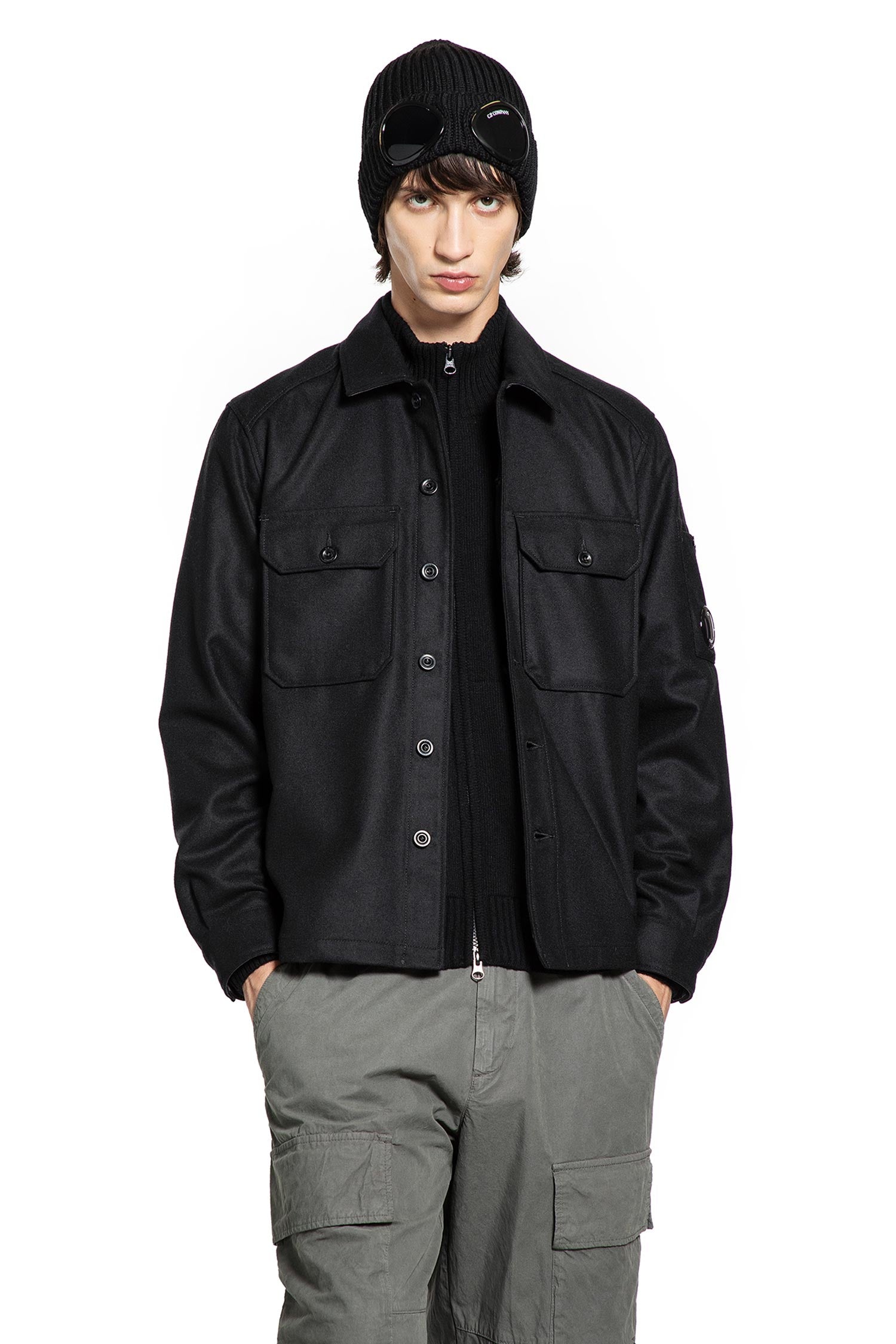 Step up your outerwear game with the C.P. COMPANY Wool Overshirt Jacket in classic black, expertly crafted from a firm yet soft wool blend for a luxe feel and lasting structure. The signature goggle hood adds a bold, street-ready edge, while discreet welt pockets and chest pockets keep essentials secure without sacrificing style. A concealed button-up closure lets you shift seamlessly from laid-back to polished, and the clean yoke with precision seams highlights the jacket s sharp, modern silhouette. Made in Romania, this piece delivers authentic craftsmanship and versatile appeal for those who demand both function and fashion.