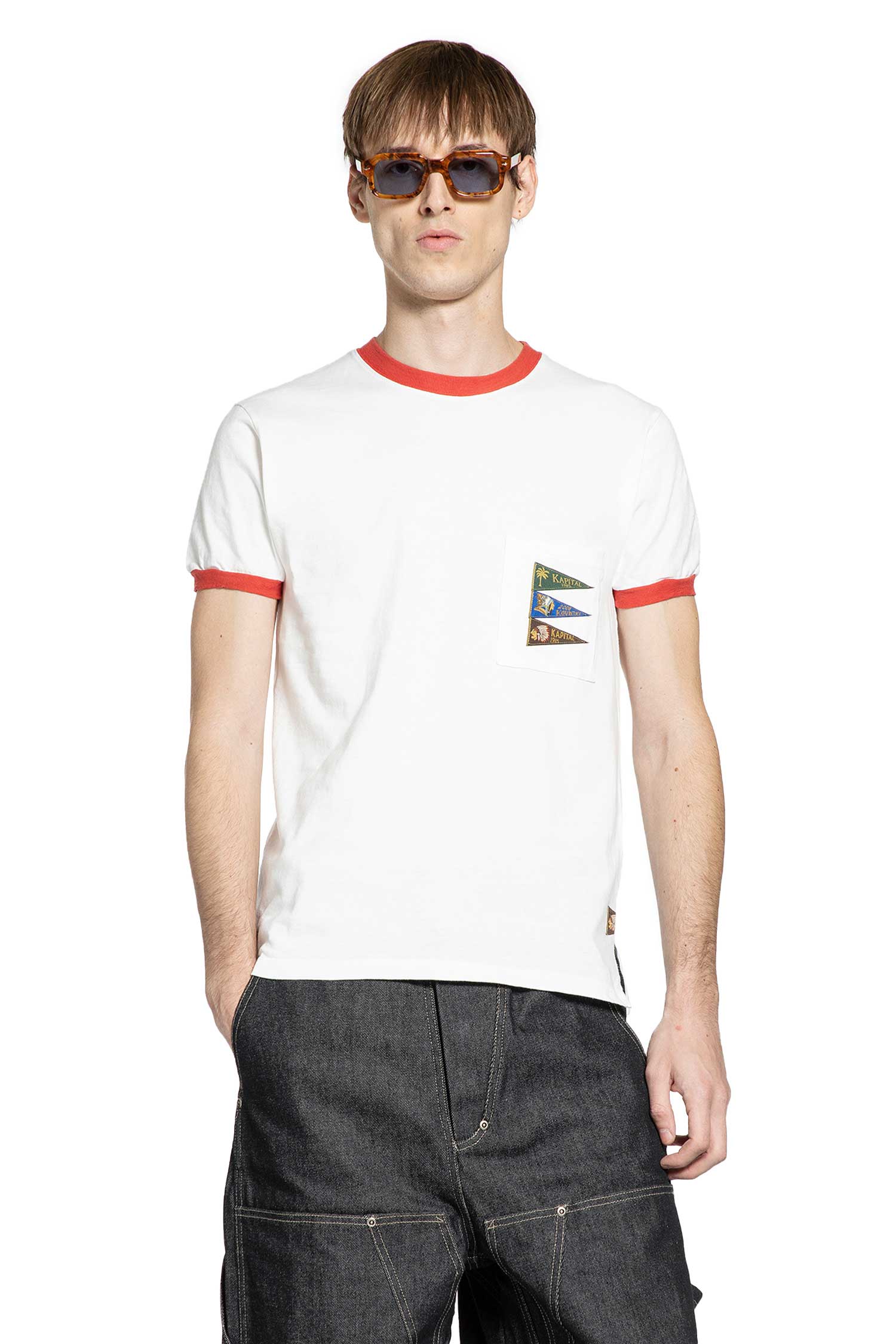 Kapital turns everyday staples into quirky, conceptual statements.The 4 Flags T-Shirt in white and red blends the brand s playful, offbeat aesthetic with clean construction. Made from cotton jersey, it features a contrast round neck, chest 4 flags print, side logo label, and side splits. Short sleeves and a slim fit keep the silhouette sharp and modern, a wearable mix of humor, craft, and minimal precision.
