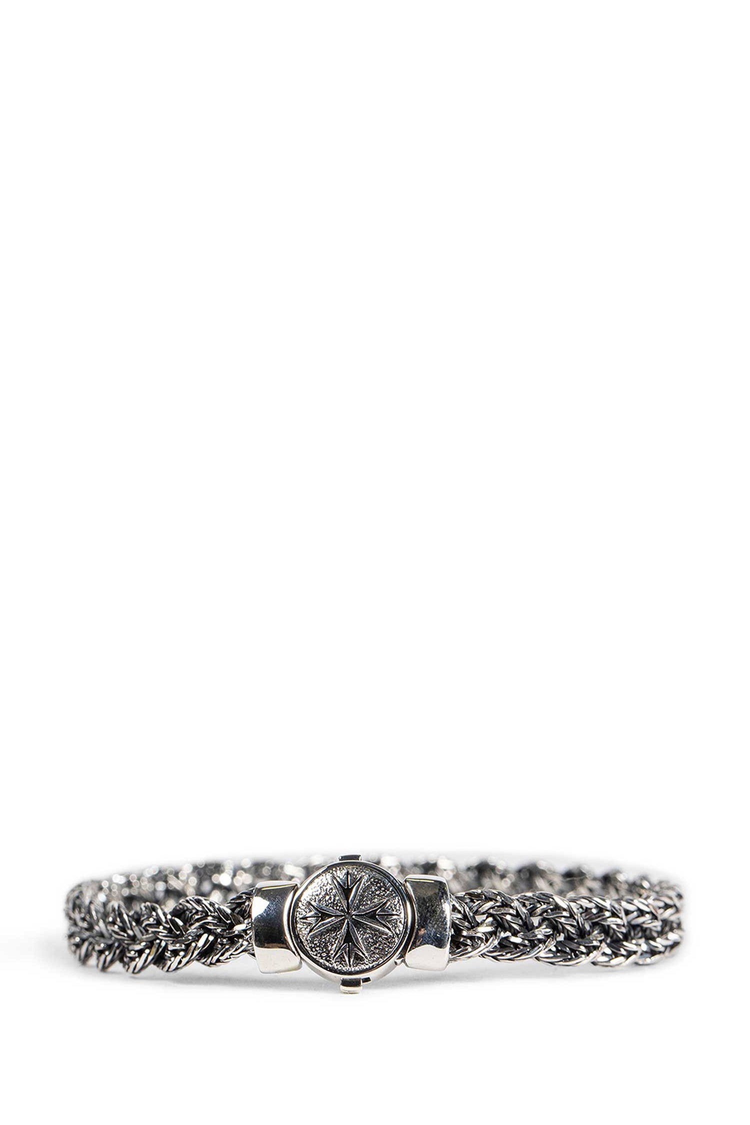 This sterling silver bracelet showcases a diamond-cut braided chain that catches the light with every movement. Defined by its intricate texture and solid structure, the design is secured with a box clasp engraved with the Emanuele Bicocchi logo a refined signature detail that completes the piece with understated identity.