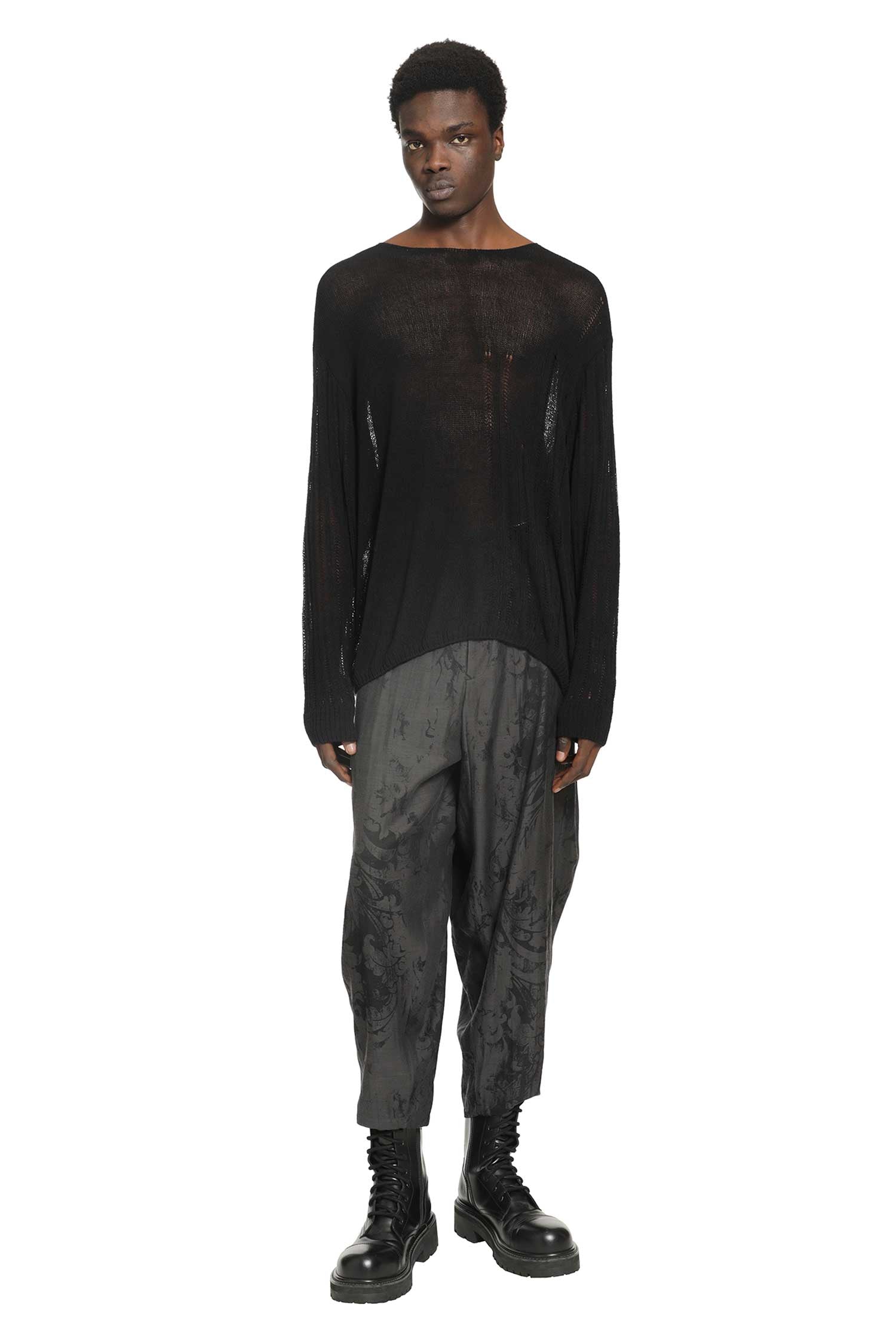Yohji Yamamoto的黑色Post Stitch毛衣体现了品牌对纹理和轮廓的前卫方法。其不规则的针法、落肩设计和雕塑般的比例反映了Yohji Yamamoto标志性的解构优雅。